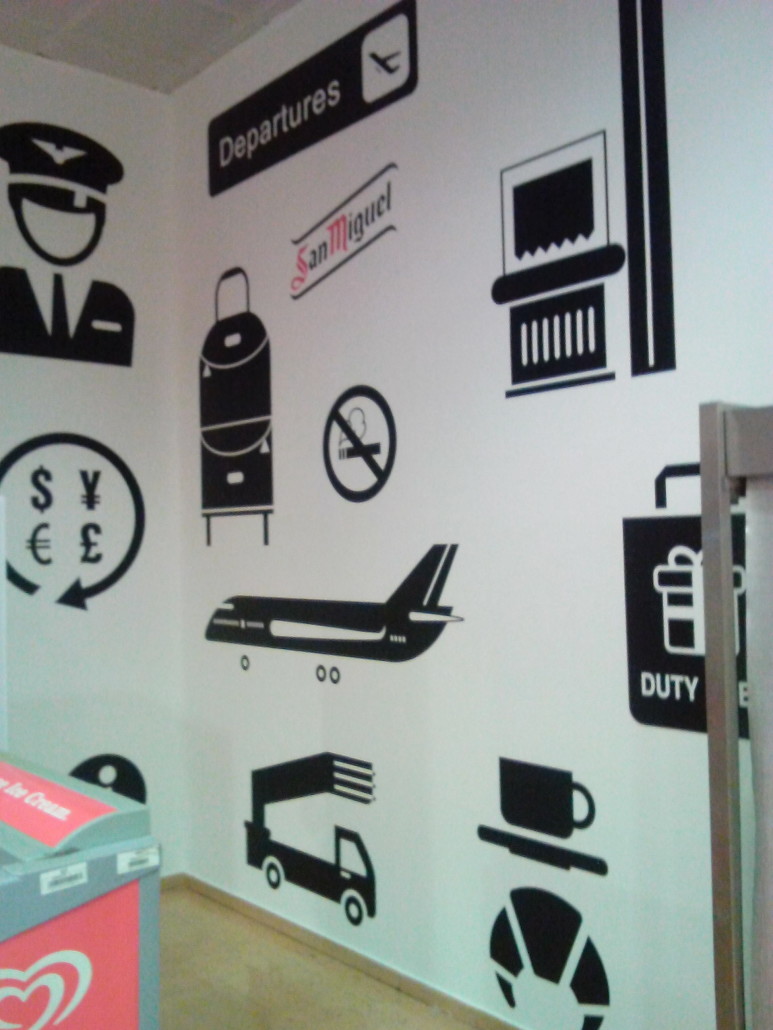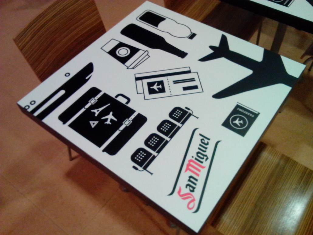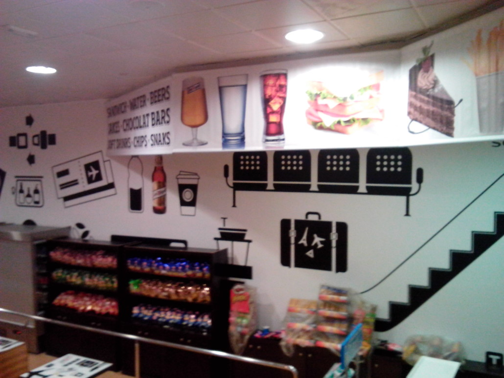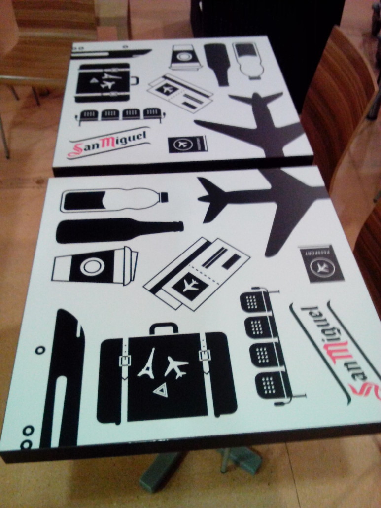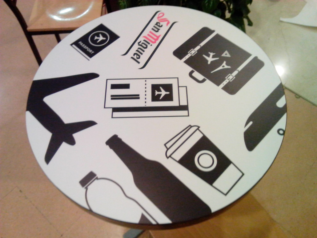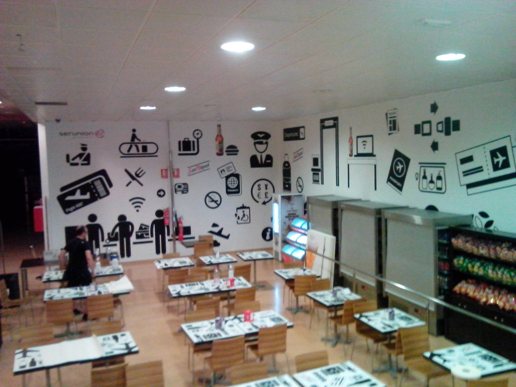 Aeropuerto San Javier. Murcia Paredes forradas con lona impresa, decoración de tapas de mesa con vinilo impreso y laminado, banner impreso con textos y productos. Categoría: Decoración Etiquetas: Proyectos Rotulación