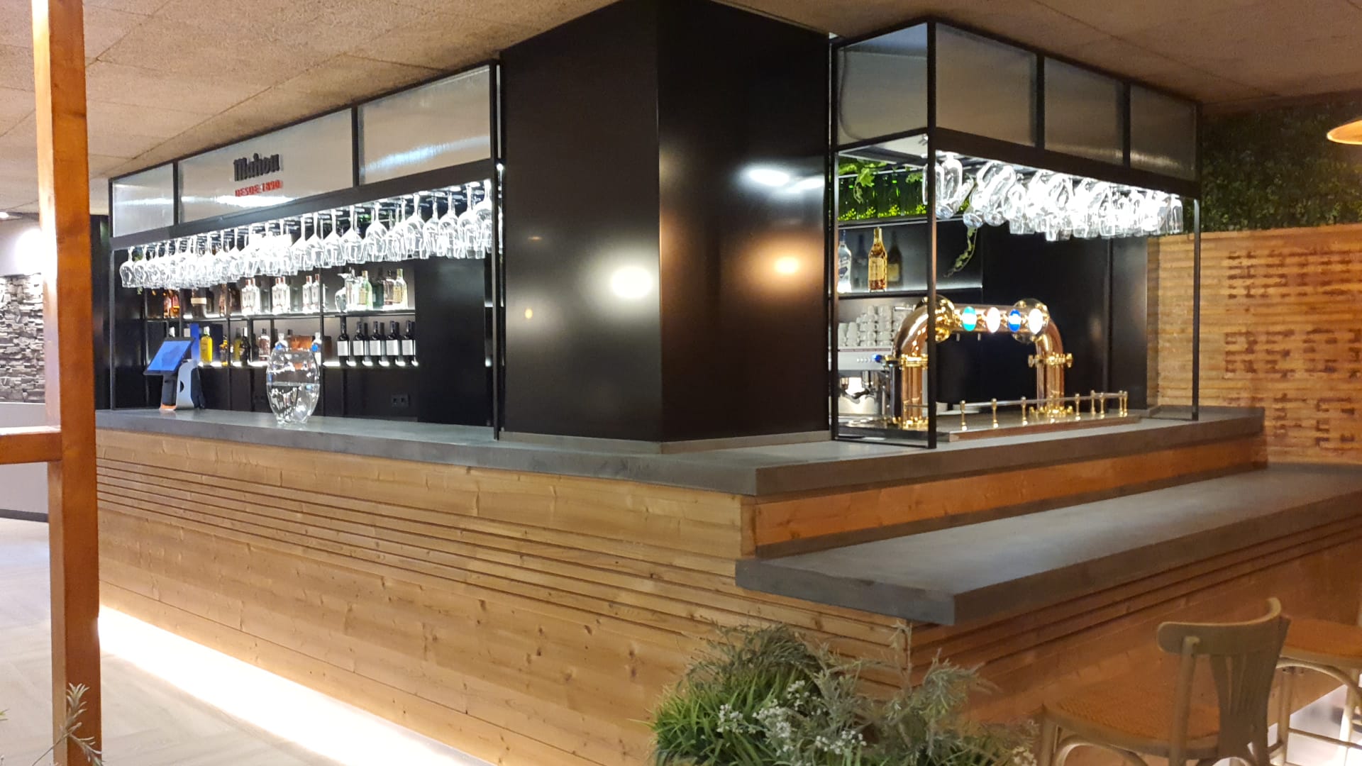 Estructura tanques Mahou en chapa metálica negra con logotipos Mahou. Tanque calado luminoso. Espacio cervecero: Estructura exterior de madera, mueble exposición en madera con iluminación LED en cada estante y logo Espacio Cervecero en chapa metálica negra con luz halo cálida.