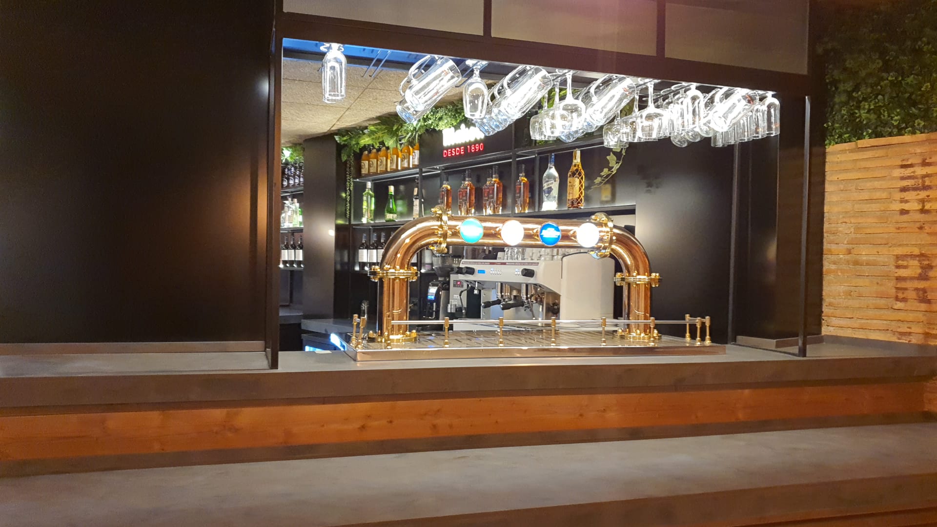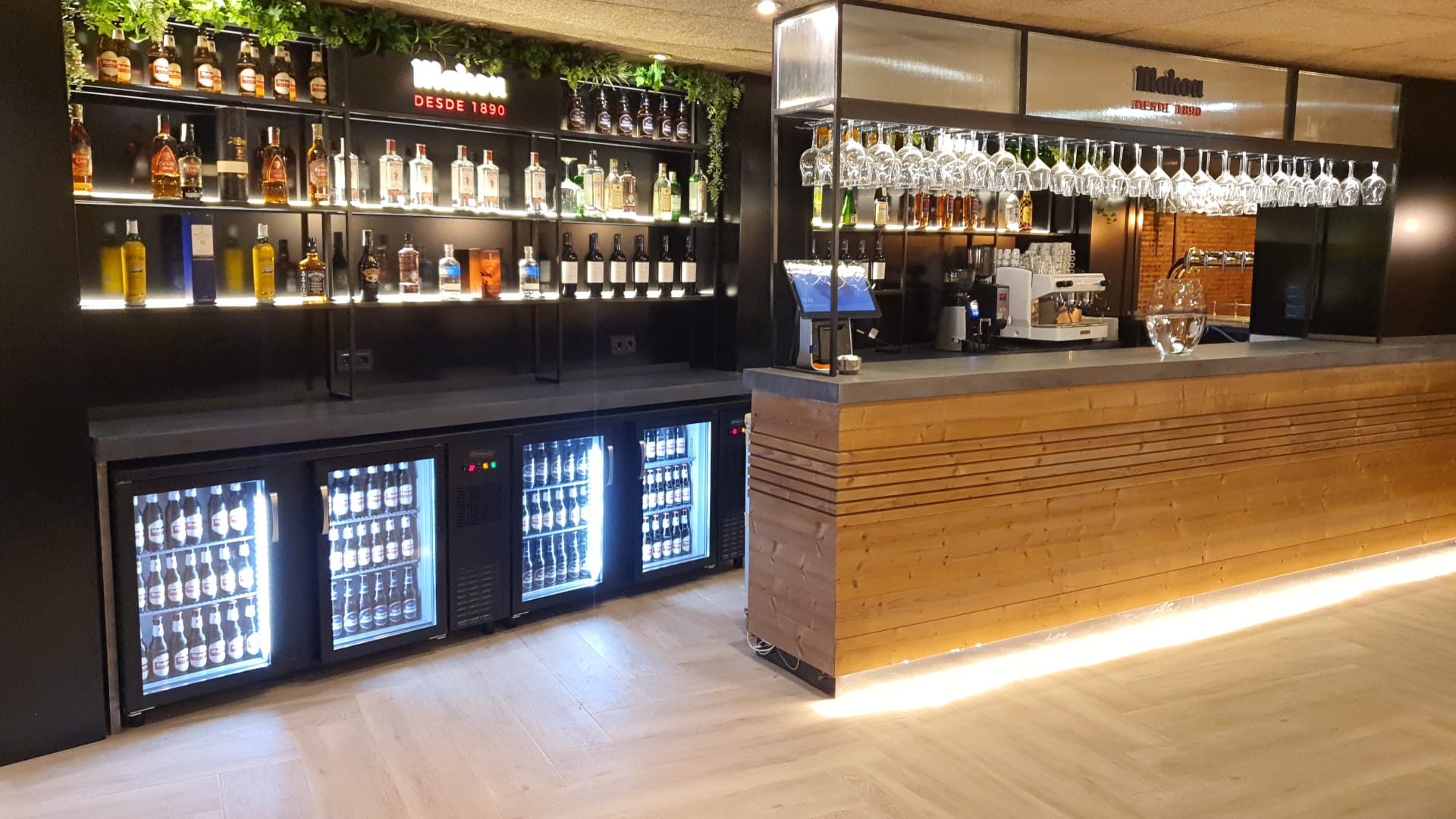 Barra interior: Icono Mahou calado luminoso, panel cuadrícula chapa negra con LED perimetral. Barra en madera mas encimera mármol negro, exposición botellas Mahou también con copero.