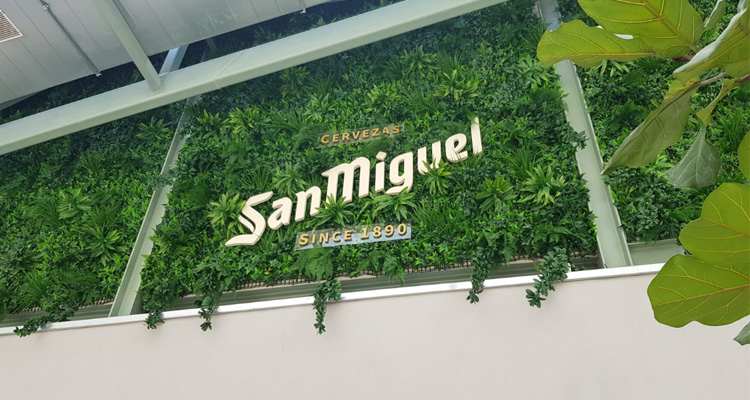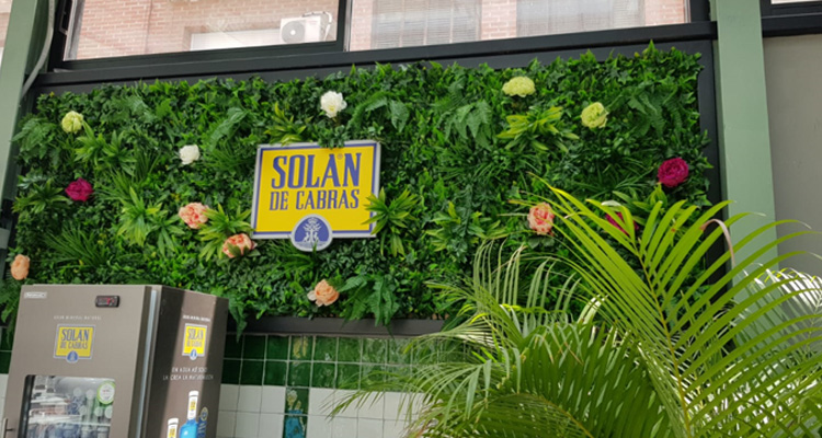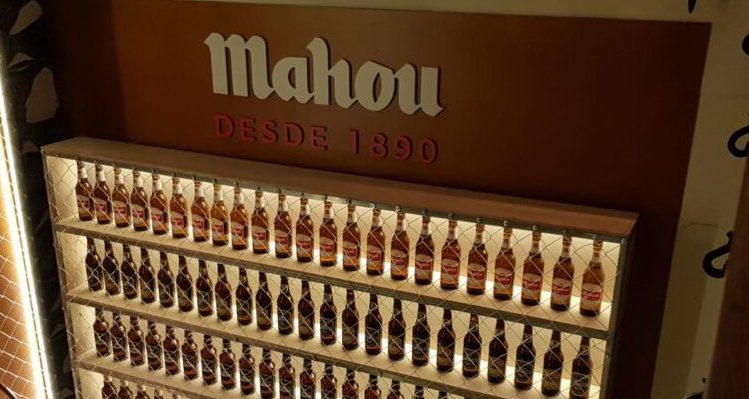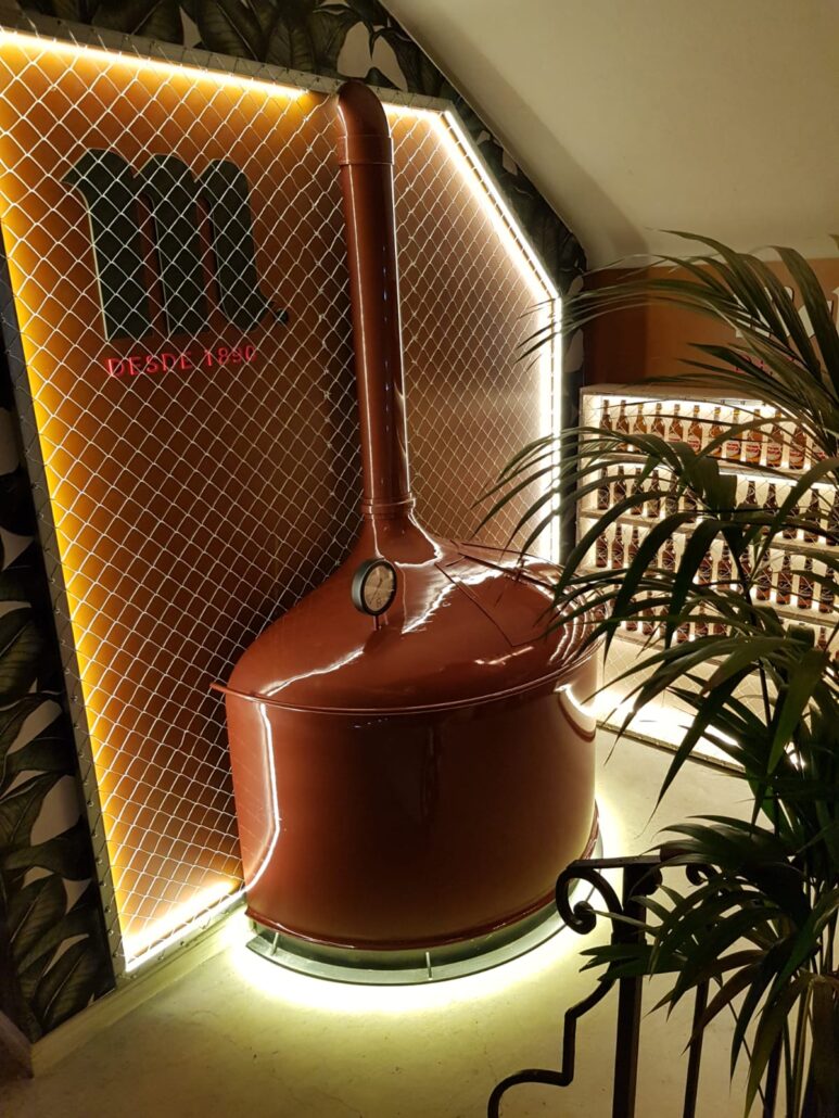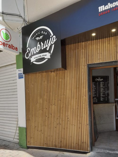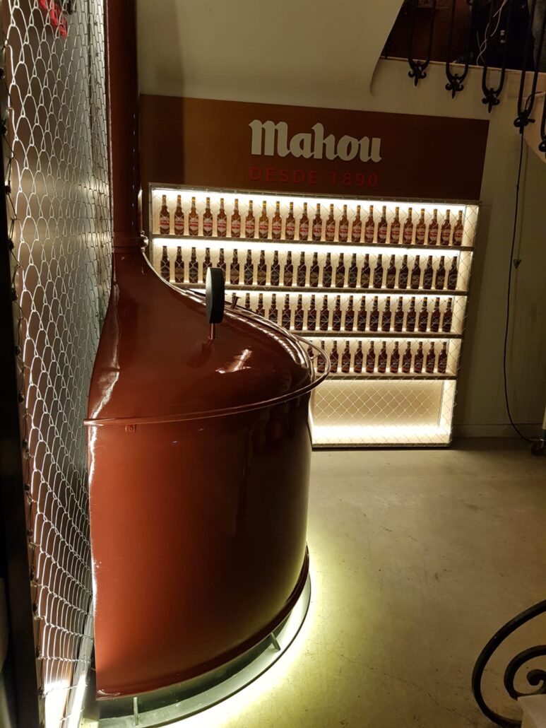 Placa composite lacada rotulada con logotipo en relieve MAHOU DESDE 1890. Conjunto urnas para botellas y celosías en relieve. Logotipo celosía en relieve, pintadas color negro. Urna con costados negros y rente incoloro, fondo color Corten. Logotipo en relieve MAHOU DESDE 1890 para zona superior barra. Decoración de pared con fondo de aluminio composite lacado Corten con logotipo en relieve, sin luz, MAHOU DESDE 1890 con estantería metálica. Estantería acabado acero galvanizado sin pintar. Baldas y frente inferior en tablero de madera rechapado roble, con barnizado incoloro. Lineales de LED con perfil de aluminio más difusor en cada estante, zona inferior con doble lineal de LED. Decoración de pared con fondo de aluminio composite lacado Corten con logotipo en relieve MAHOU DESDE 1890 sin luz. Marco en acero galvanizado natural con malla metálica, en dos piezas. Iluminación perimetral LED con perfil de aluminio mas difusor. Réplica de Alambique seccionado por la mitad con iluminación LED en la base. Jardín vertical artificial, cubriendo zona superior de pared interior con flores artificiales, añadidas. Logotipo SAN MIGUEL en relieve, con texto principal en iluminación LED efecto halo y textos secundarios. Logotipo SOLAN DE CABRAS, con iluminación efecto halo, color azul sobre jardín vertical artificial, incluyendo flores artificiales. Separador de puertas plegables, con estructura metálica lacada en negro, compuesto por un fijo superior y 5 hojas verticales con divisiones tipo panel japonés. Acristalado con vidrio catedral de color rojo semi-oscuro. Separador de puertas plegables con estructura metálica lacada en negro, compuesto por un fijo superior y 8 hojas verticales, con divisiones tipo panel japonés. Acristalado con vidrio catedral de color ocre oscuro, apertura desde el centro hacia los laterales, incluye rótulo en zona superior CERVEZAS ALHAMBRA en bajo relieve lacado en acero.